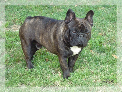Ah Harold, un sacré petit mâle : il sait charmer tous ceux qui le rencontrent. Son surnom : "la brique". Malgré son jeune âge, déjà un grand voyageur puisqu'il a fait le vol Bordeaux-Lyon sans stress à l'âge de 2 mois. Sa particularité : il sait faire comme les chiens d'arrêt, le coulé, cette façon de marcher au ralenti le plus près possible du sol. Seulement lui ce n'est pas pour signaler du gibier mais pour jouer avec un autre chien ! C'est un petit gabarit (poids : 11,5 kg) tout en muscles.