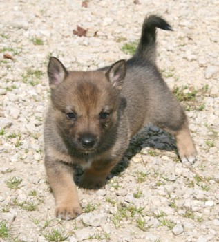 " Des nouvelles de Doline : le voyage a été difficile la première demi-heure, quelques pleurs et gémissements. Grâce aux caresses et à la douceur de Marine, Doline s'est calmée et se sentant en sécurité, blottie dans les bras de Marine, elle s'est endormie. A l'arrivée à la maison, elle a fait connaissance avec Vanille, chienne de la grand-mère des filles que l'on garde souvent, et avec son environnement et le reste de la petite famille. Elle a joué puis après la dernière ballade du soir, s'est endormie dans son panier avec son nounours. Réveil agréable avec quelques pipis dans la maison ... premiers jeux dans le jardin avec Vanille (les premières photos). Doline envoie un jappement pour ses parents et frères et soeurs."