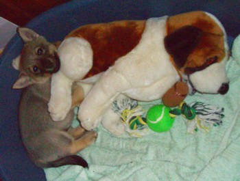 "Bonjour, le voyage de retour s'est bien passé, il a bien regardé le paysage et s'est laissé gentiment bercé par la voiture. La découverte de la maison s'est bien passée et notre petit guerrier apprécie tout particulièrement le côté terrasse ! Sa première fut bonne, il a un gros copain (st bernard en peluche) pour lui tenir chaud. Aujourd'hui il est parti à la découverte du quartier."